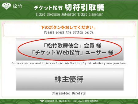 切符引取機の最初に表示されている画面より「松竹歌舞伎会」会員様 「チケットWeb松竹」ユーザー様と書かれているボタンをタップしてください。