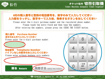 「松竹歌舞伎会」会員様・「チケットWeb松竹」ユーザー様は、切符引取機の画面に、6桁の購入番号と登録の電話番号の末尾4桁を入力して、チケットをお受け取りください。